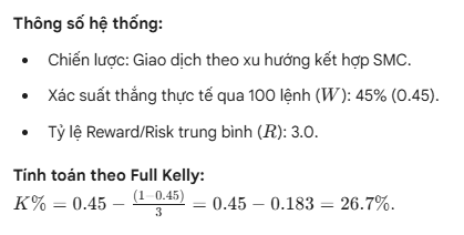 - Rủi ro đồng biến (Correlated Risk): Nếu bạn vào 5 lệnh khác nhau nhưng cùng chịu ảnh hưởng bởi đồng USD, tổng rủi ro Kelly của bạn phải được chia đều cho 5 lệnh đó, không được đánh Full Kelly cho từng lệnh.